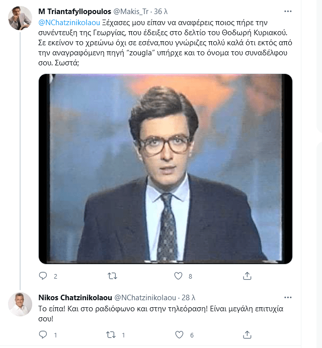 «Ξέχασες μου είπαν να αναφέρεις ποιος πήρε τη συνέντευξη της Γεωργίας, που έδειξες στο δελτίο του Θοδωρή Κυριακού. Σε εκείνον το χρεώνω όχι σε εσένα, που γνώριζες πολύ καλά ότι εκτός από την αναγραφόμενη πηγή “zougla” υπήρχε και το όνομα του συναδέλφου σου. Σωστά;» ανέφερε ο Μάκης Τριανταφυλλόπουλος.