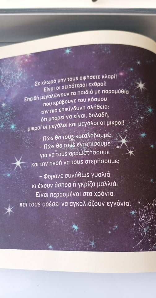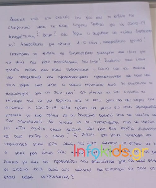 “Δόθηκε χθες στο σχολείο του γιου μου το βιβλίο του εξαιρετικού κατά τα άλλα Ευγένιου Τριβιζά για τον Covid-10. Απογοήτευση; Θυμό; Δεν ξέρω τι ακριβώς να νιώσω διαβάζοντάς το. Απαράδεκτο για ηλικία 4-6 ετών, απαράδεκτο γενικά!