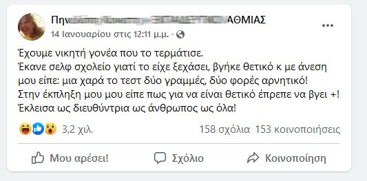 Γονέας που ξέχασε να κάνει το self test στο παιδί του, κλήθηκε στο σχολείο να το πραγματοποιήσει άμεσα. Όταν το τεστ έγινε και έδειξε δύο γραμμές, ο γονέας απευθύνθηκε στη διευθύντρια λέγοντας: “μια χαρά το τεστ δύο γραμμές, δύο φορές αρνητικό!”