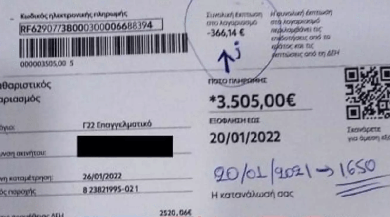 Πιο συγκεκριμένα, η ΔΕΗ ζητά από τον εν λόγω επαγγελματία να καταβάλει μέχρι τις 20 Ιανουαρίου του τρέχοντος έτους, το ποσό των 3.505 ευρώ (!) για κατανάλωση ρεύματος στην επιχείρησή του.