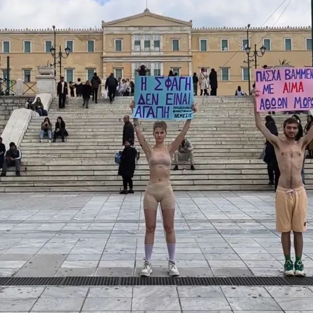 «Ήρθαμε εδώ για να διαμαρτυρηθούμε. Είμαστε vegan ακτιβιστές και είμαστε κατά των σφαγών του Πάσχα. Για το έθιμο αυτό σφάζονται πάνω από δύο εκατομμύρια μωρά, αρνάκια και κατσικάκια. Είμαστε εδώ για να καταλάβει ο κόσμος ότι αυτό το έθιμο δεν πρέπει να υφίσταται άλλο, γιατί υπάρχουν θύματα. Τα ζώα έχουν δικαίωμα στη ζωή και στην αυτονομία του σώματός τους, όπως έχουμε και εμείς οι άνθρωποι» σημειώνει.