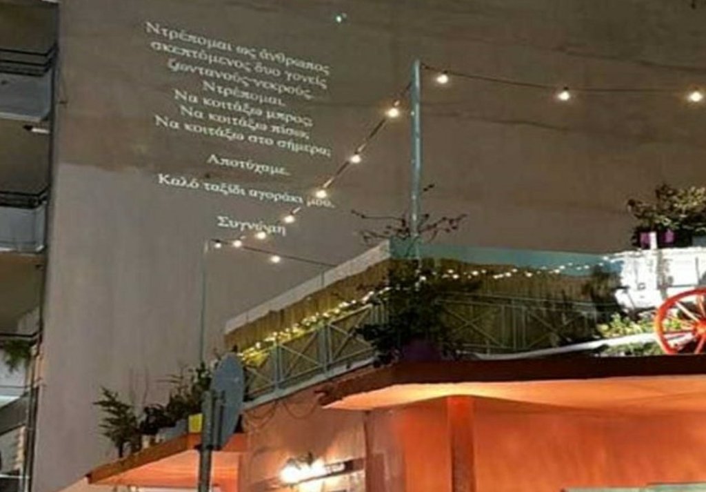 Με μήνυμα που προβλήθηκε μέσω προτζέκτορα από την ταράτσα σε διπλανή πολυκατοικία, οι ιδιοκτήτες και οι εργαζόμενοι του καταστήματος “Λατέρνα” προκάλεσαν ρίγη συγκίνησης σε όσους διερχόμενους και θαμώνες έτυχε να το δουν και να το διαβάσουν.