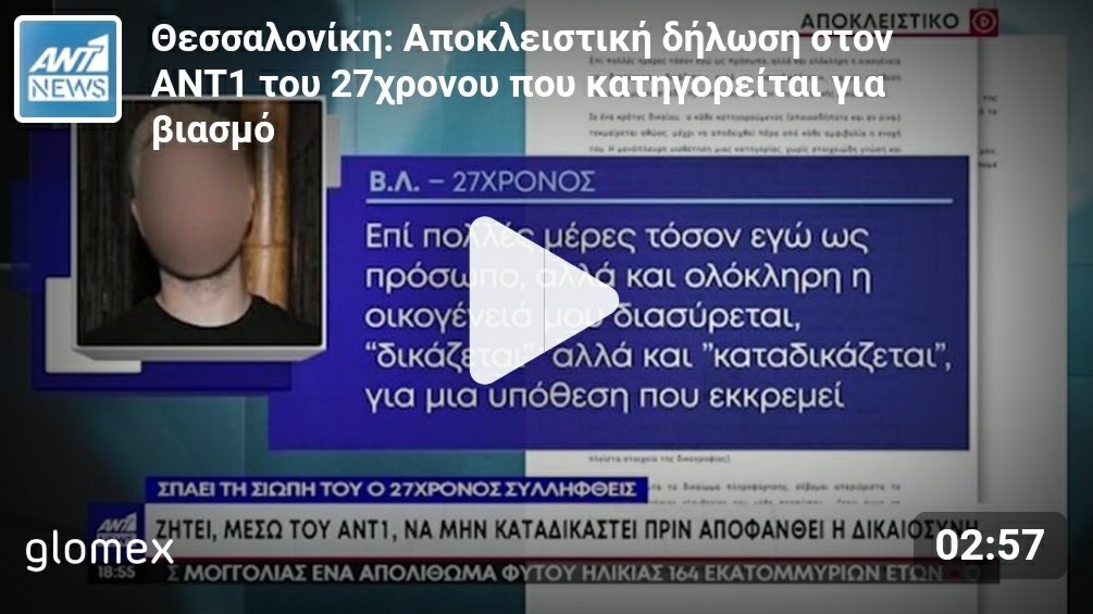 Είκοσι ημέρες μετά τις καταγγελίες για βιασμό, ο νεαρός που συνελήφθη από την αστυνομία απέστειλε δήλωση στον ΑΝΤ1, την οποία ο σταθμός πρόβαλε στο κεντρικό δελτίο ειδήσεων.