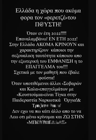“Ελλάδα η χώρα που ακόμα φορά τον “φερετζέ” του π@@@τη Όταν εν έτη 2022, επαναλαμβάνω εν έτει 2022. Στην Ελλάδα ακόμα κρίνουν και χαρακτηρίζουν κάποιοι την σεξουαλική ταυτότητα κάποιου από την εξωτερική του εμφάνιση ή από το επάγγελμά του. Σχετικά με τον μαθητή που φόρεσε φούστα. Όταν υποτιθέμενοι άλλοι σοβαρών και καλά επαγγελμάτων με κοστούμια είναι τίγκα στην παιδεραστία και στα ναρκωτικά, όργια και τρα@@@κια. Δεν έχω να πω κάτι άλλο από το να λέω ότι μένω, κρίνομαι και ζω στην μπου@@@@λας”.
