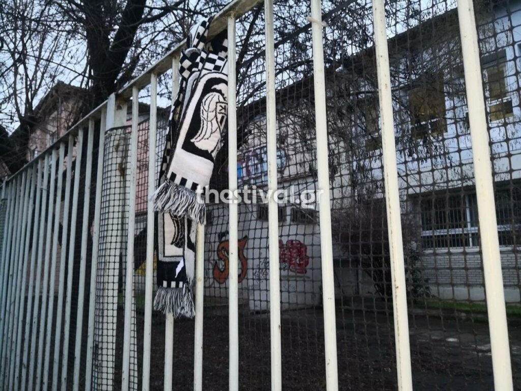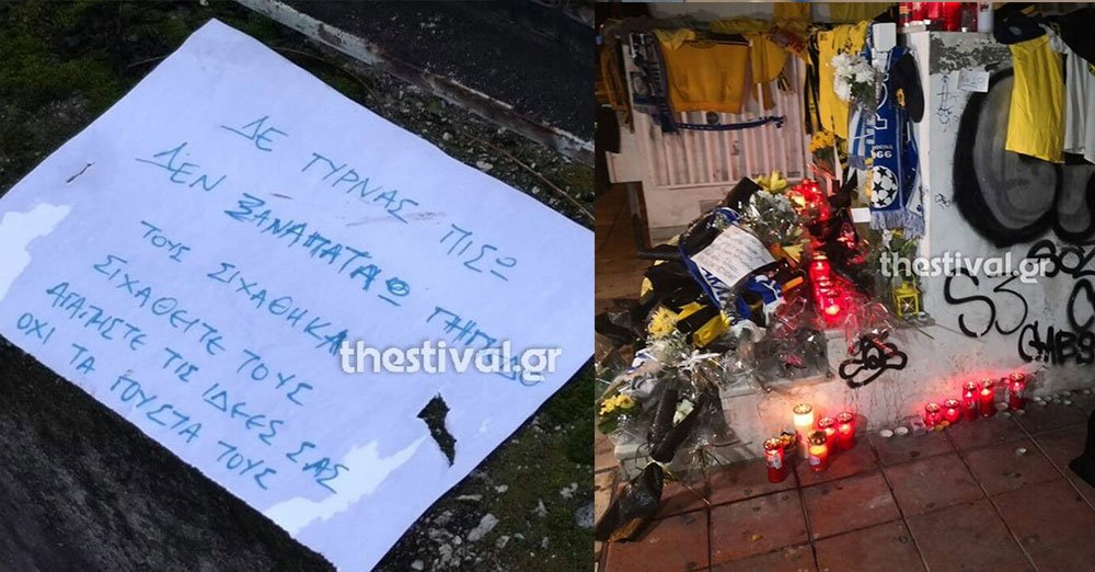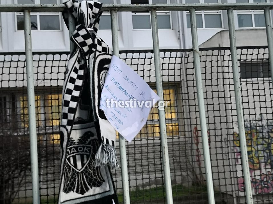 Ένα γραπτό σημείωμα μαζί με ένα κασκόλ του ΠΑΟΚ, άφησε άγνωστος στα κάγκελα του σχολείου που βρίσκεται απέναντι από το σημείο που δολοφονήθηκε ο 19χρονος.