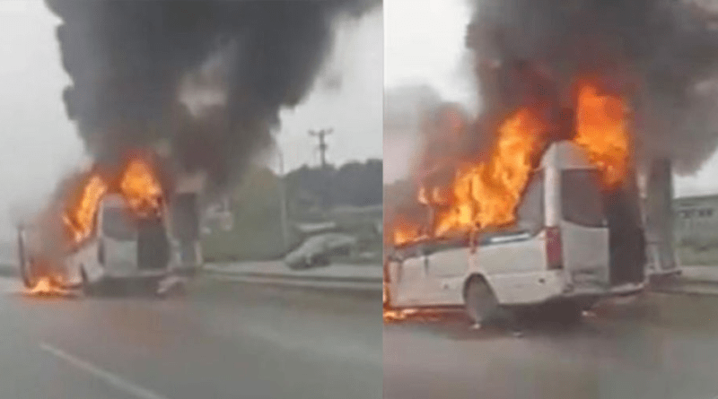 Στις φλόγες τυλίχθηκε μικρό λεωφορείο που μετέφερε προσκυνητές από το Άγιο Όρος έξω από το χωριό Λάκκωμα στη Χαλκιδική.