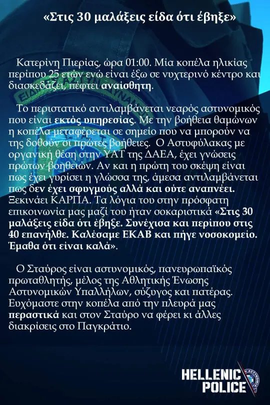 «Το “ευχαριστώ” είναι λίγο», φέρεται να του είπε συγκινημένη. Οι δυο τους κατάγονται από την Κατερίνη, όμως μέχρι εκείνο το βράδυ δε γνωρίζονταν. Τώρα, ο 27χρονος είναι πλέον ο άνθρωπος που της έσωσε τη ζωή.