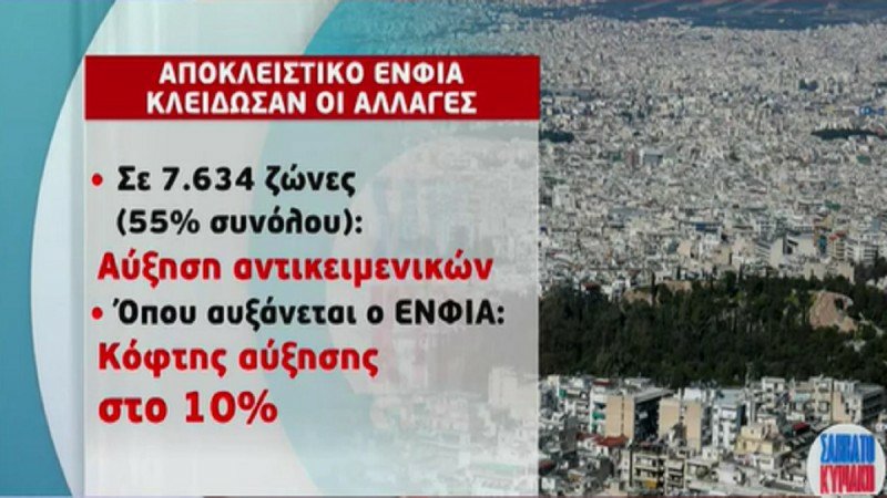 Δεν προβλέπεται κάποια αλλαγή στους συντελεστές του ΕΝΦΙΑ, ωστόσο θα υπολογιστεί με νέες αντικειμενικές αξίες. Αυτό σημαίνει ότι στο 55% των περιοχών (σε 7634 ζώνες) που αυξήθηκαν οι αντικειμενικές αξίες θα αυξηθεί και ο ΕΝΦΙΑ, επομένως το κράτος βάζει ένα «κόφτη» 10%. Για τους υπόλοιπους θα ισχύει διεύρυνση των εισοδηματικών και περιουσιακών κριτηρίων.