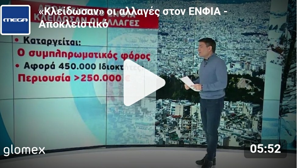 Οι αλλαγές στον ΕΝΦΙΑ αφορούν 7 εκατομμύρια ιδιοκτήτες ακινήτων. Σύμφωνα με πληροφορίες, καταργείται ο συμπληρωματικός φόρος, δηλαδή το πρόσθετο χαράτσι. Αυτό αφορά 450.000 ιδιοκτήτες ακινήτων με περιουσία άνω των 250.000 ευρώ.