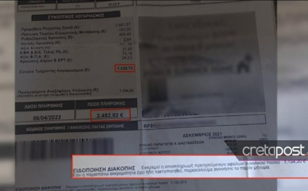 Οι λογαριασμοί του ρεύματος αυξάνονταν μήνα με τον μήνα και ο κ. Γ. έψαξε πολλούς τρόπους ρύθμισης των χρεών. Χτύπησε πόρτες, παρακάλεσε αλλά δυστυχώς έπεφτε συνεχώς σε ώτα μη ακουόντων. Ζήτησε από την εταιρεία του ρεύματος διακανονισμούς και κάθε φορά έγραφε και έσβηνε πάνω στους λογαριασμούς ώστε να καταφέρει να ανταποκριθεί στις υποχρεώσεις του. Το cretapost από σεβασμό στην αγωνία, την προσωπικότητα και τα προσωπικά δεδομένα αυτού του ανθρώπου έσβησε τους υπολογισμούς και τις σημειώσεις που έκανε με το χέρι του πάνω στο χαρτί.