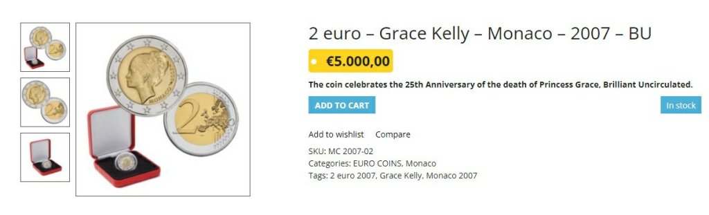 Στο μπροστινό του μέρος δεν διαφέρει από κανένα άλλο 2ευρω, ωστόσο στο πίσω μέρος υπάρχει το προφίλ του προσώπου της βραβευμένης με Όσκαρ, Πριγκίπισσας του Μονακό, Grace Kelly. H αλήθεια είναι πως ελάχιστοι το έχουν δει από κοντά (αν και έχουν δημιουργηθεί αρκετά ψεύτικα αντίγραφα), με την τιμή του νομίσματος αυτή τη στιγμή να ξεπερνάει τα 4.000 ευρώ, αν το ψάξει κάποιος στο διαδίκτυο