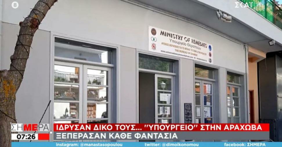 Υπουργείο…θεραπειών στην Αράχωβα ίδρυσαν οι αυτοαποκαλούμενοι «θεματοφύλακες του Συντάγματος». Πρόκειται για ένα κατάστημα που προσφέρει από φυσικές «θεραπείες» με γαϊδουράγκαθο και φασκόμηλο για το μυαλό, το σώμα και την ψυχή μέχρι…δωρεάν rapid test σημειώνοντας ότι εκεί δεν υπάρχει νόμος για τον κορωνοϊό.