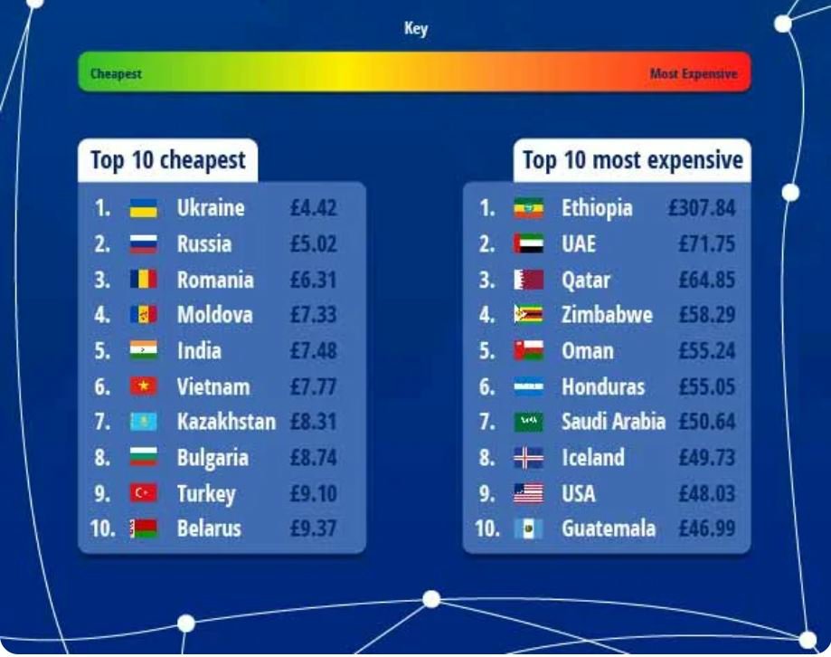 Η Αιθιοπία είναι πιο ακριβή από οποιαδήποτε άλλη χώρα, με το κόστος σύνδεσης να βρίσκεται στα 307,84£ το μήνα, ακολουθούμενη από τα Ηνωμένα Αραβικά Εμιράτα με 71,75£ και το Κατάρ με 64,85£. Αντιθέτως, δεν θα βρείτε φθηνότερη τιμή από της Ουκρανίας με 4,42£ τον μήνα, αλλά και τη Ρωσία με κόστος 5,02£.