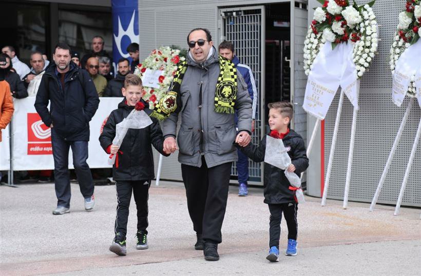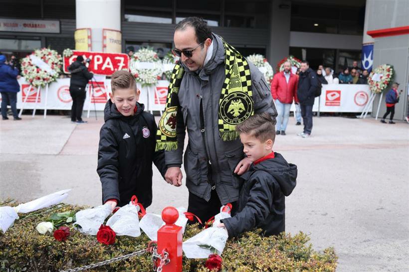 40 χρόνια μετά, στον προαύλιο χώρο του Καραϊσκάκη, εμφανίζεται ένας πατέρας με το κασκόλ της ΑΕΚ που κρατά από το χέρι του δύο μικρούς γιους του, οι οποίοι φορούν μπουφάν του Ολυμπιακού, και όλοι μαζί αποθέτουν λουλούδια στη μνήμη των νεκρών.