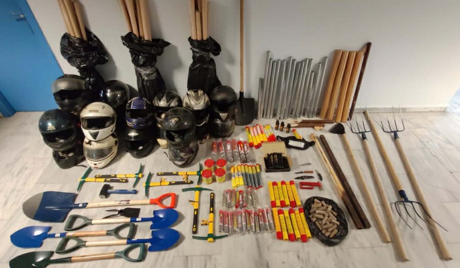 Οι αστυνομικοί βρήκαν στον σύνδεσμο Φίλων ΠΑΟΚ «Θύρα 4», ο οποίος στεγάζεται σε διαμέρισμα επί της Παλαιών Πατρών Γερμανού στο κέντρο της πόλης, μεταλλικά και ξύλινα ρόπαλα, φτυάρια, αξίνες, τσάπες, τσουγκράνες, κράνη και πολλά καπνογόνα.