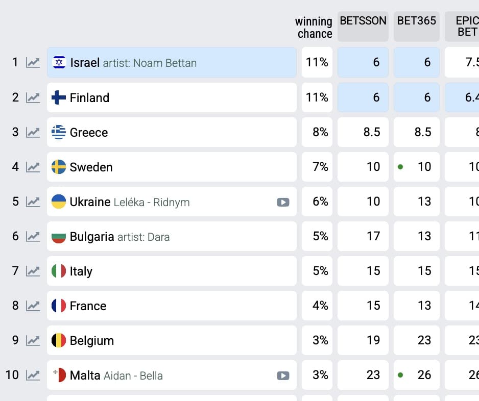 Μετά την παρουσίαση των τραγουδιών που θα διαγωνιστούν στον ελληνικό τελικό, η χώρα βρέθηκε από την 15η θέση στην 3η σύμφωνα με τα γραφεία στοιχημάτων.