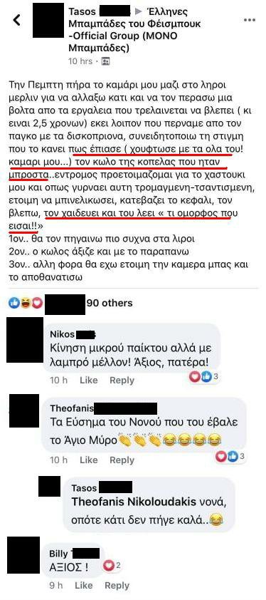 Όπως τονίζεται εύστοχα και στην ανάρτηση – καταδίκη του εν λόγω περιστατικού ” Οι Έλληνες μπαμπάδες του facebook συνεχίζουν την παράδοση του να εξυμνούν τις παραβιαστικές συμπεριφορές των γιων τους, καποιοι από τους οποιους θα μεγαλώσουν να γίνουν οι βιαστές του αύριο. Κοιτάξτε με τι καμάρι το λεει που έπιασε γυναικείο κώλο, αφού χάζεψε τα εργαλεία φυσικά, γιατί αυτή είναι βρε η “αντρική φύση”, τρυπάνια και γυναικείοι κώλοι απο 2.5 χρονών!Φυσικά από την πανηγυρική διάθεση του πατέρα το παιδάκι όχι μόνο δε θα καταλάβει ότι έκανε κάτι κατακριτέο αλλά θα περάσει στη συνείδησή του ότι αυτό που έκανε είναι μαγκιά και θα το επαναλάβει γιατι ακριβώς αυτό του δίδαξε ο πατέρας.Ταυτόχρονα η αντίδραση της κοπέλας που προφανώς θεωρεί οτι “boys will be boys” θα του δώσει το μήνυμα οτι οι γυναικες γουστάρουν τέτοιες συμπεριφορές, ιδίως αν εισαι ομορφος. Και ακριβώς έτσι καλλιεργείται η κουλτούρα του βιασμού, που θεωρεί το γυναικείο σώμα ως κάτι που υπάρχει για να το αρπάζουν τα αγορια και που δεν τα κρατάμε ποτέ υπόλογα γι αυτό αλλά αντιθέτως τα ενθαρρύνουμε. Αρκεί να φανταστούμε πως θα αντιδρούσε ο ίδιος πατέρας αν η 2.5 χρονων κορούλα του πήγαινε να αγγίξει τον κώλο ή αλλα σεξουαλικοποιημένα μέρη ενός άντρα.Εκεί σιγουρα δε θα εκλαμβανόταν ως χαριτωμένο δείγμα οτι της αρέσουν οι άντρες ούτε θα έφερνε τις κάμερες.
