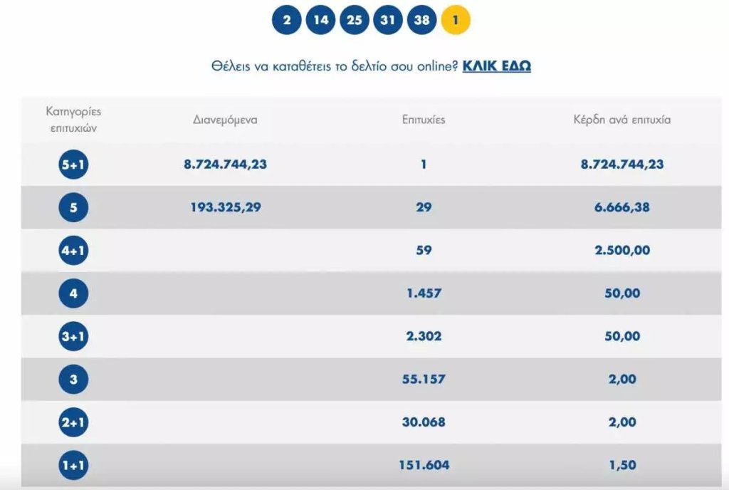 Συγκεκριμένα κέρδισε 8.724.744,23 ευρώ και ενώ το τυχερό δελτίο φέρει και 19 επιτυχίες στη 2η κατηγορία (έχει βρει πέντε νούμερα) όπου η κάθε επιτυχία κερδίζει από 6.666,38 ευρώ!