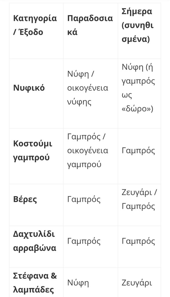 Στην Ελλάδα δεν υπάρχει πλέον αυστηρός κανόνας. Άλλες φορές πληρώνουν οι οικογένειες, άλλες το ζευγάρι μοιράζεται τα πάντα, και σε αρκετές περιπτώσεις ένας από τους δύο κάνει κάποιο συμβολικό «δώρο» (π.χ. το νυφικό ή το ταξίδι του μέλιτος).