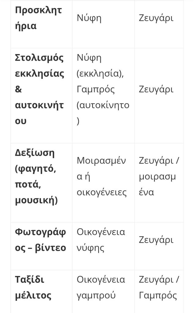 - Νυφικό και κοστούμι (ο καθένας καλύπτει το δικό του)