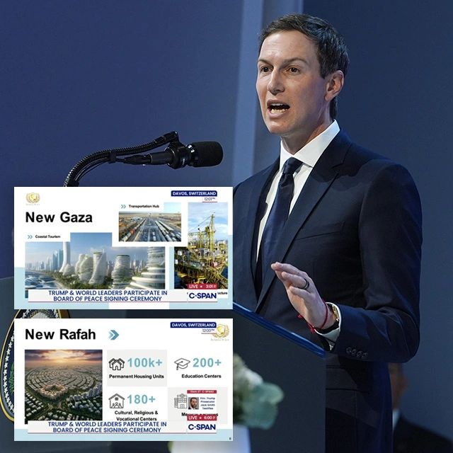 - Ο Τζάρεντ Κούσνερ παρουσίασε ένα σχέδιο ανοικοδόμησης της Γάζας, εκτιμώμενου κόστους τουλάχιστον 25 δισεκατομμυρίων δολαρίων, κατά τη διάρκεια εκδήλωσης στο Νταβός.