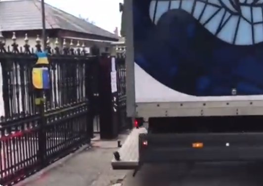 Όπως φαίνεται σε βίντεο που κυκλοφόρησαν στα social media, το φορτηγό ορμά με την όπισθεν στην πύλη της πρεσβείας, ενόσω διαδηλωτές συγκεντρωμένοι στο σημείο τον επευφημούν. Μάλιστα, με το που ρίχνει την σιδερένια καγκελόπορτα με το φορτηγό του, ο οδηγός βγαίνει από το όχημα και δείχνει φωτογραφίες νεκρών αμάχων στην Ουκρανία. «Θέλω ο πρέσβης και οι φίλοι του να φύγουν από την χώρα, φύγετε από αυτή την ελεύθερη χώρα. Είναι ώρα να υψώσουμε το ανάστημά μας. Έκανα το καθήκον μου. Είναι ώρα να το κάνει και η υπόλοιπη Ιρλανδία», ακούγεται να δηλώνει