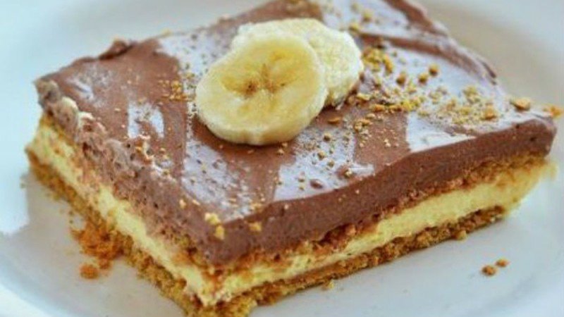 Σημείωση: Προαιρετικά, μπορείτε να βάλετε μπανάνες και μέσα στο γλυκό σας. Σε αυτή τη περίπτωση θα χρειαστείτε 3 μεγάλες ώριμες μπανάνες κομμένες σε λεπτές φέτες, με τις οποίες θα καλύψετε τη στρώση κρέμας βανίλιας. Από πάνω θα συνεχίσετε τη διαδικασία με τη δεύτερη στρώση μπισκότων και στρώση κρέμας σοκολάτας.