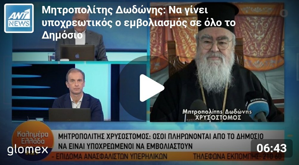 Ο μητροπολίτης Χρυσόστομος τόνισε στην τηλεόραση του ΑΝΤ1 ότι οι ιερείς θα πρέπει να εμβολιαστούν αρχικά για να προστατέψουν τους εαυτούς τους και στη συνέχεια όλους τους υπόλοιπους και είναι αδιανόητο να αγνοούν το εμβόλιο που είναι το μεγάλο όπλο της επιστήμης για να αντιμετωπίσουμε τον κορωνοϊό.