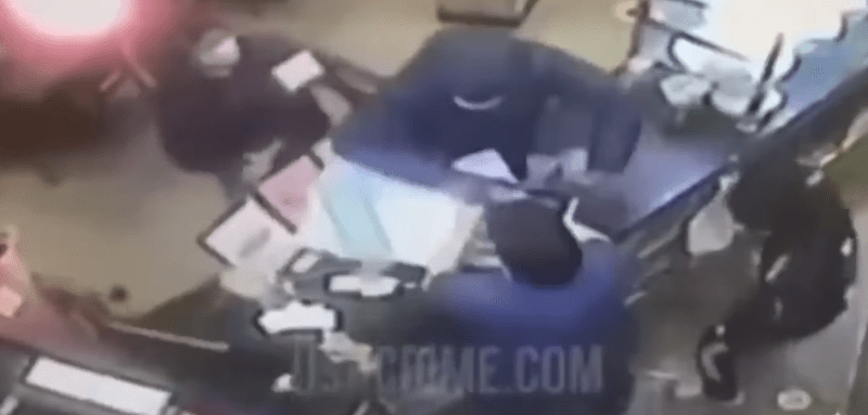Το βίντεο δείχνει τον μασκοφόρο ληστή να στέκεται στον πάγκο και μετά να πλησιάζει όταν ένας υπάλληλος ανοίγει το ταμείο. Ο υπάλληλος της πιτσαρίας τσακώνεται και ακολουθεί μάχη, με τον ληστή να τραβάει το ταμείο προς το μέρος του για να πιάσει τα χρήματα μέσα.