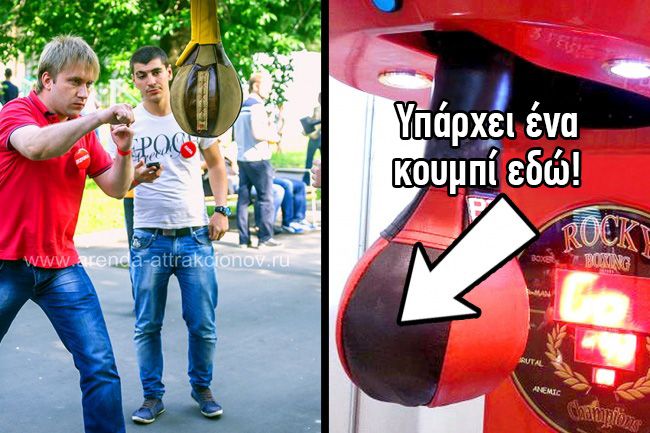 Έχετε δει πιθανώς τέτοια μηχανήματα σε πάρκα ψυχαγωγίας. Οι κανόνες είναι συνήθως ότι χτυπάτε τον σάκο και το ίδιο και ο ιδιοκτήτης του μηχανήματος. Αν κάνετε υψηλότερο σκορ, κερδίζετε ένα βραβείο. Οι ιδιοκτήτες είναι συνήθως μικρά παιδιά που δεν μοιάζουν να μπορούν να κερδίσουν, αλλά πάντα κερδίζουν ούτως ή άλλως. Όπως αποδεικνύεται, αυτό το μηχάνημα δεν αντιδρά στη δύναμη της γροθιάς σας αλλά στο σημείο που χτυπάτε. Υπάρχει ένα κρυφό κουμπί στον σάκο που πρέπει να χτυπήσετε για να κάνετε το υψηλότερο σκορ. Βρίσκεται ακριβώς στη μέση. Τώρα ξέρετε το μυστικό και θα κερδίζετε κάθε φορά!