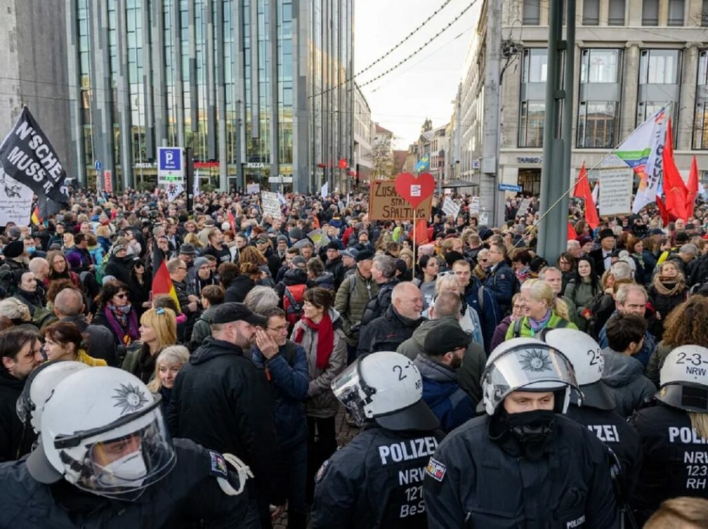 Οι διαδηλωτές φώναζαν συνθήματα όπως «ειρήνη», «ελευθερία», «καμία δικτατορία» και «αντίσταση». Παρόμοιες διαδηλώσεις πραγματοποιούνται εδώ και εβδομάδες σε καθημερινή βάση παντού στη Γερμανία. Οι συμμετέχοντες είναι αρνητές του κορωνοϊού, άτομα που διαφωνούν με την επιβολή υποχρεωτικού εμβολιασμού, αλλά και ακροδεξιοί.