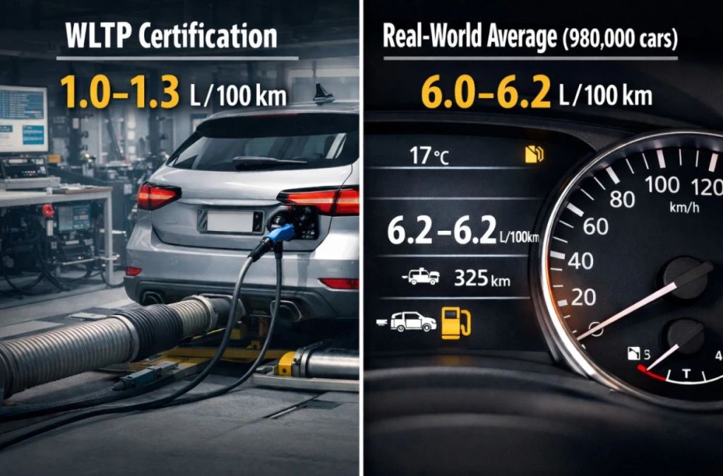 Σύμφωνα με την ευρωπαϊκή νομοθεσία και τον κύκλο μέτρησης WLTP, η μέση κατανάλωση των plug-in hybrid υπολογίζεται στα 1,57 lt/100 km. Στην πράξη όμως, η πραγματική μέση κατανάλωση ανέρχεται στα 6,12 lt/100 km. Δηλαδή σχεδόν τέσσερις φορές υψηλότερη από την επίσημη τιμή.
