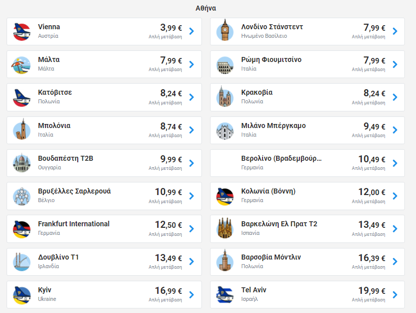 Αντίστοιχα μεγάλες προσφορές και για πτήσεις από την Αθήνα, με την Βιέννη να φιγουράρει στην πρώτη θέση με 3,99 ευρώ, ενώ Λονδίνο, Μάλτα, Ρώμη, Κατόβιτσε, Κρακοβία, Μπολόνια, Μιλάνο, Βουδαπέστη, Βερολίνο, Βρυξέλλες, Κολωνία, Φρανκφούρτη, Βαρκελώνη, Δουβλίνο, Βαρσοβία, Κίεβο και Τελ Αβίβ κοστίζουν από 7 έως 20 ευρώ.