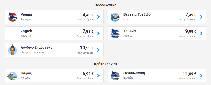 Παράλληλα, από τα Χανιά βρίσκουμε στα 6,99 ευρώ την πτήση για Πάφο και στα 11,09 ευρώ την πτήση προς Θεσσαλονίκη.